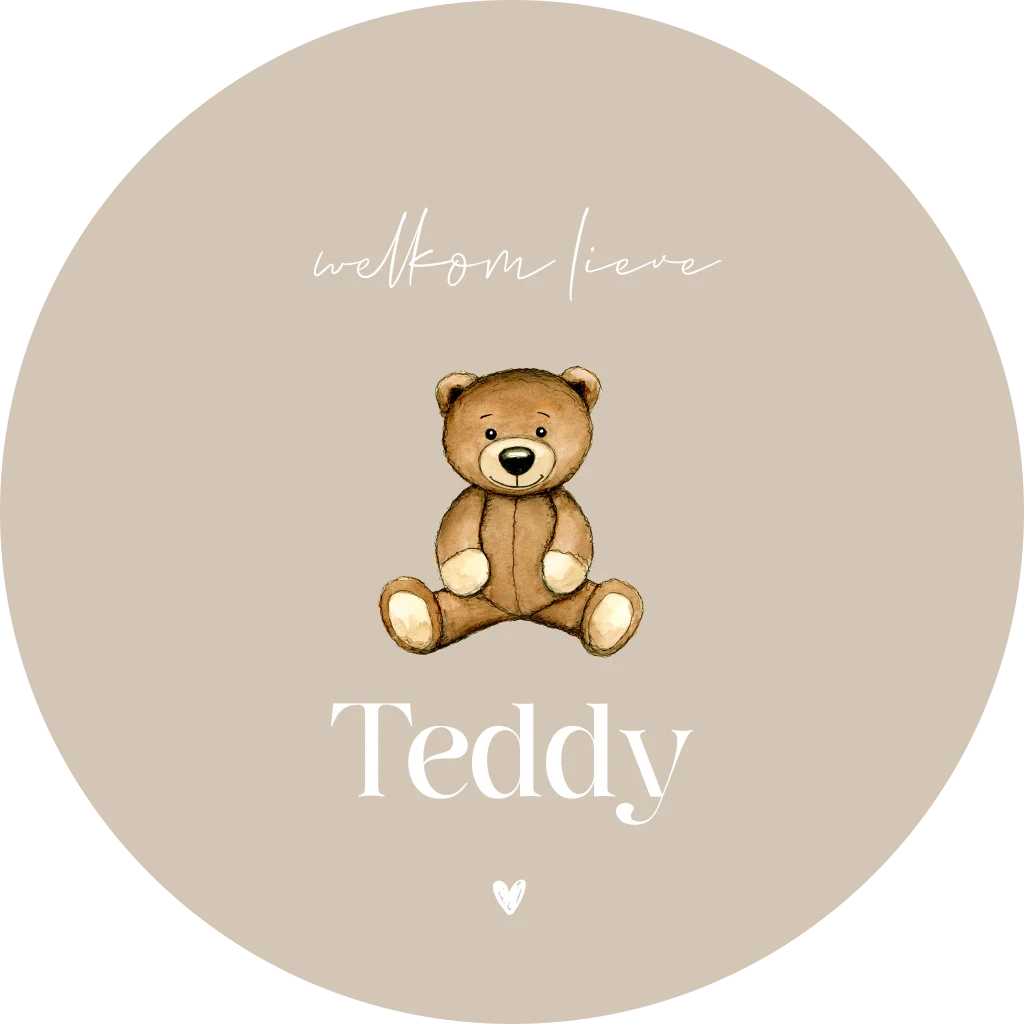 Kondig de geboorte van jullie kindje aan met deze ronde raamsticker. De sticker heeft een lichtbruine achtergrond met een teddybeer en een lief hartje. De sticker is naar wens aan te passen in onze online opmaaktool. Tip: zonder geboortedatum kun je de sticker al voor de geboorte in huis halen!
