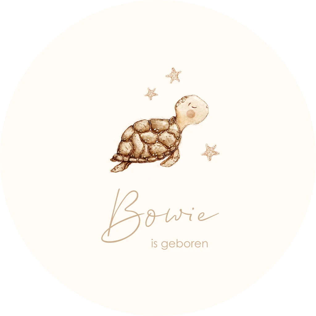 Een stijlvolle en lieve ronde raamsticker voor jouw kindje. De sticker heeft een prachtige beige illustratie van een schildpadje omringd door zeesterren. Daaronder is ruimte voor tekst. Pas het ontwerp naar wens aan in onze online editor.