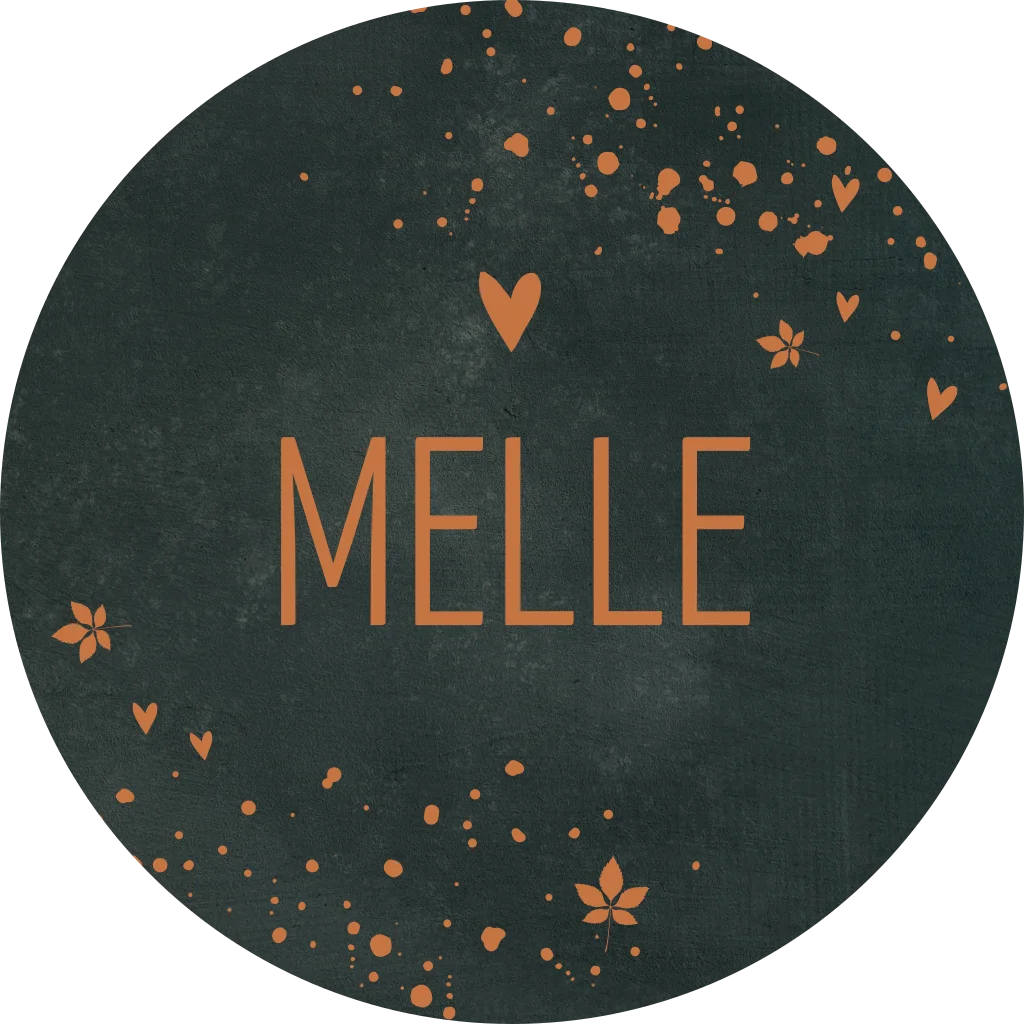 Een stoere raamsticker om de geboorte van jullie zoontje aan te kondigen! Op de grijze achtergrond staat de naam in roestbruin centraal in hippe typografie met een hart erboven. Langs de rand een wolk van spetters, hartjes en bloemetjes in roestbruin.
