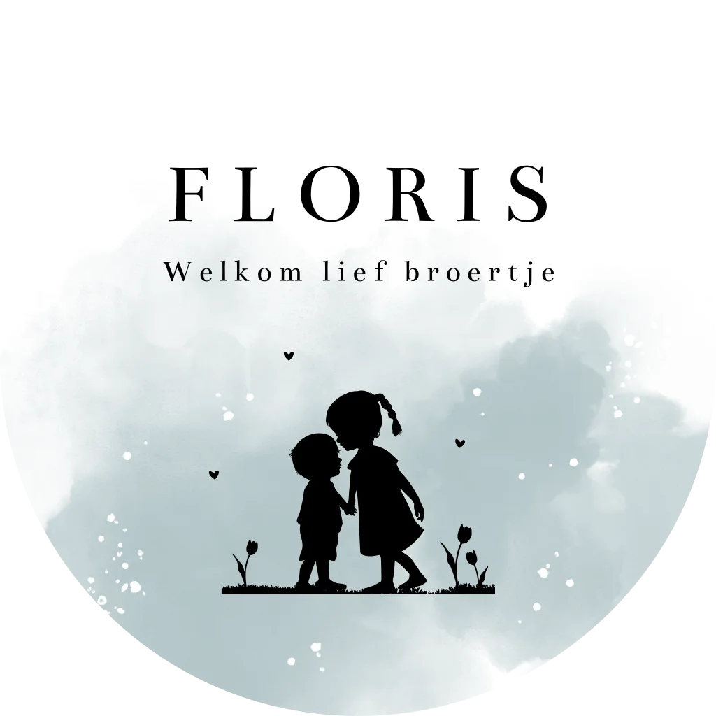 Schattige raamsticker om de geboorte van een broertje aan te kondigen! Onder de naam in trendy letters staat het zwarte silhouet van grote zus die haar kleine broertje kust. Op de achtergrond grijsblauwe waterverf met kleine hartjes en spetters.