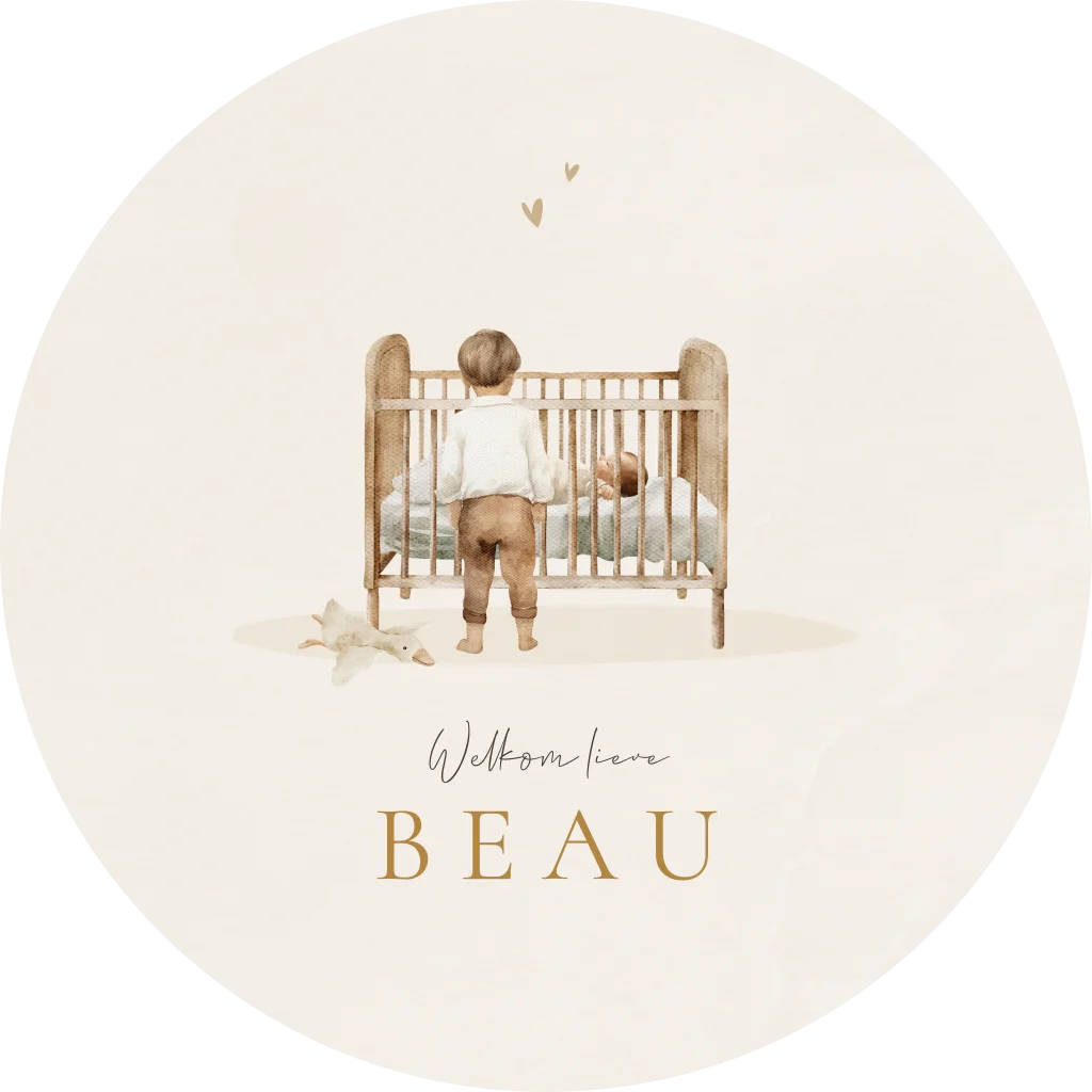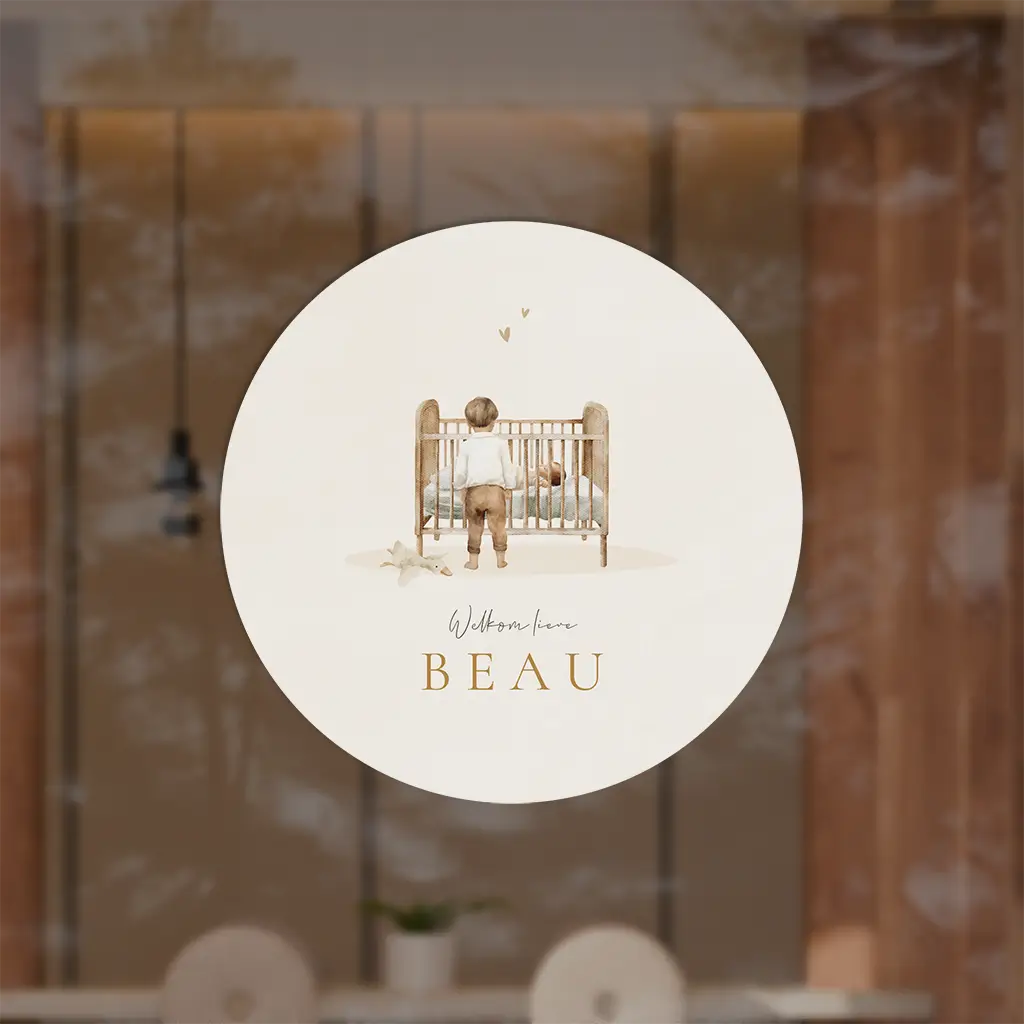 Kondig de geboorte van jullie kindje aan met deze stijlvolle raamsticker. De sticker heeft prachtige illustraties van een grote broer bij het ledikantje van zijn broertje of zusje. De kleuren zijn erg zacht. Pas het ontwerp naar wens aan in onze online editor.