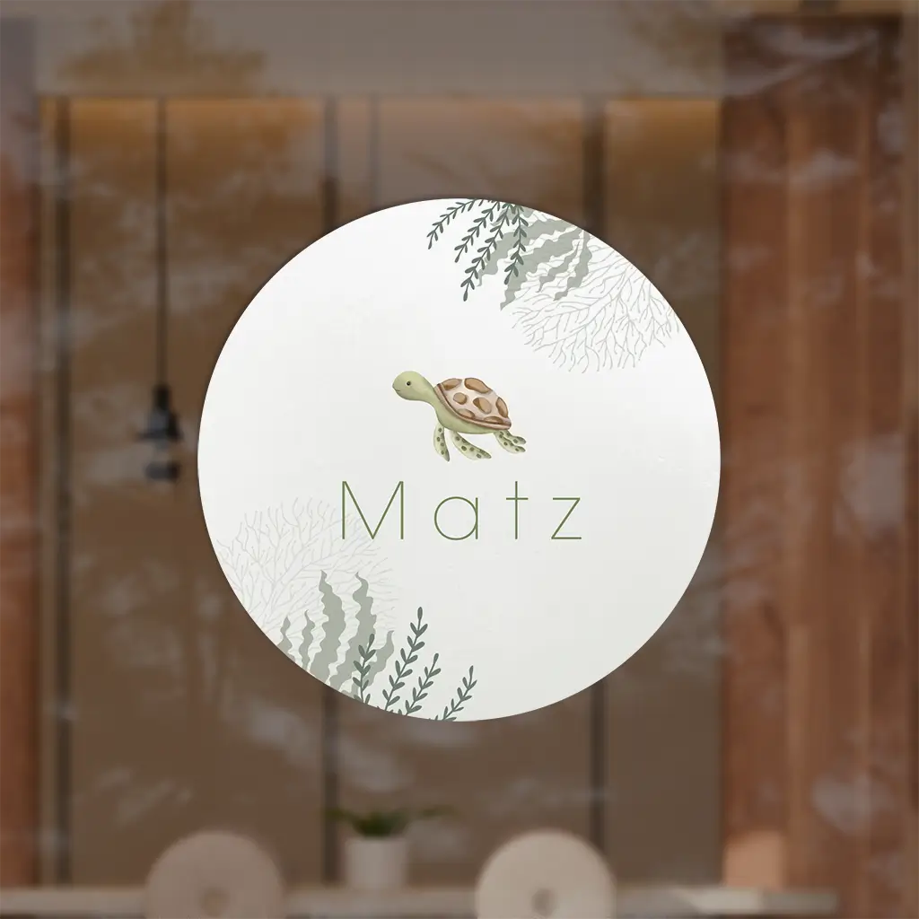 Laat iedereen weten dat je kleintje is geboren met deze raamsticker! De sticker heeft een lichtgroene achtergrond met de illustratie van een zeeschildpad en zeeplanten. Pas de sticker helemaal naar wens aan in onze online editor.
