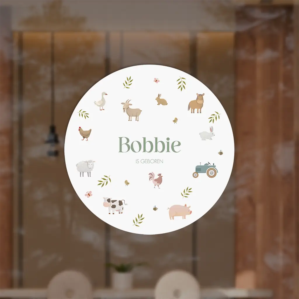 Deze raamsticker past perfect bij jullie geboortekaartje. De sticker heeft een witte achtergrond met lieve boerderij diertjes. De sticker is naar wens aan te passen in onze online editor.