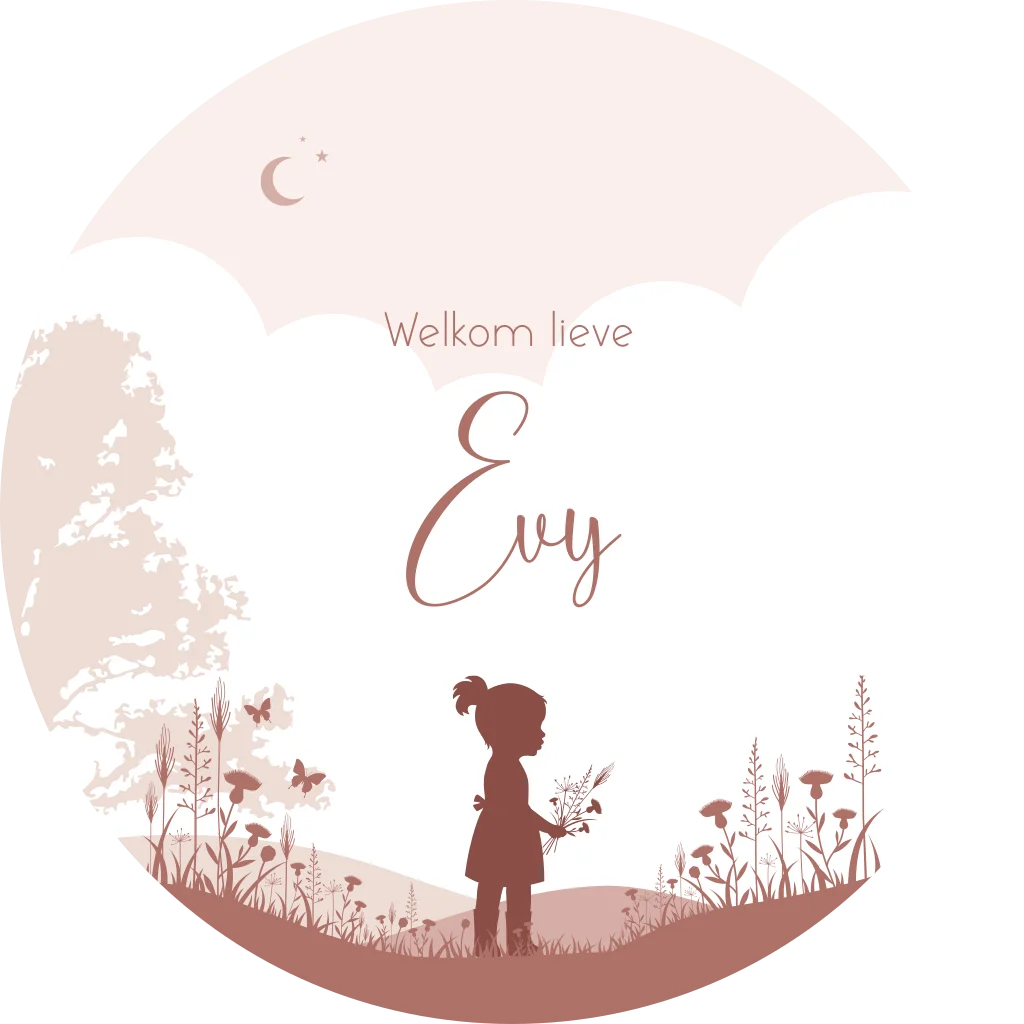 Dit is een mooie raamsticker voor je pasgeboren dochter. In een abstract landschap staat het silhouet van een meisje tussen de bloemen. De raamsticker kan helemaal naar wens aangepast worden in onze online editor.