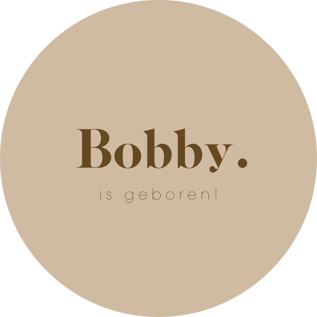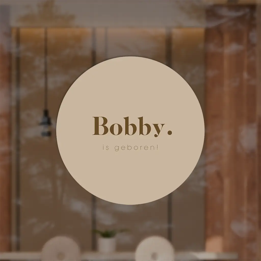 Een hippe ronde raamsticker voor jouw kindje. De sticker heeft een bruine mokka achtergrond kleur. In het midden lees je de naam van het kindje. Pas het ontwerp naar wens zelf aan.