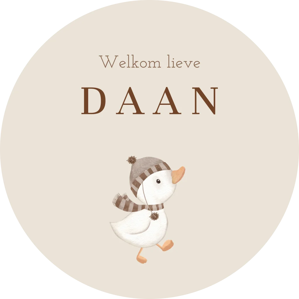 Een ronde raamsticker om de geboorte van jouw kindje aan te kondigen . De sticker heeft een beige achtergrond. Daarop zie je een lieve illustratie van een winters eendje. Het eendje heeft een muts op en sjaal om. Pas de ronde raamsticker naar wens aan in onze online editor.