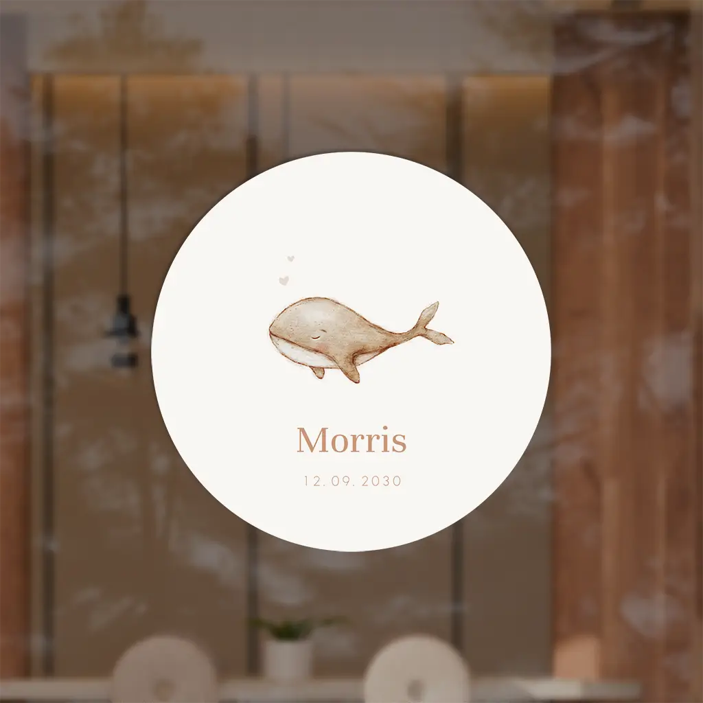 Een stijlvolle ronde raamsticker voor jouw kindje. De sticker heeft een prachtige beige illustratie van een walvis. Daaronder is ruimte voor tekst. Pas het ontwerp naar wens aan in onze online editor.