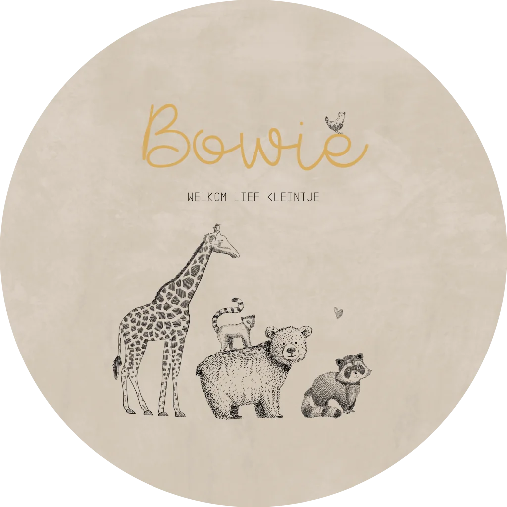 Wat een schattige ronde raamsticker voor jouw kindje. De sticker heeft een beige achtergrond met daarop lieve pentekeningen van een giraffe, beer en andere jungledieren.