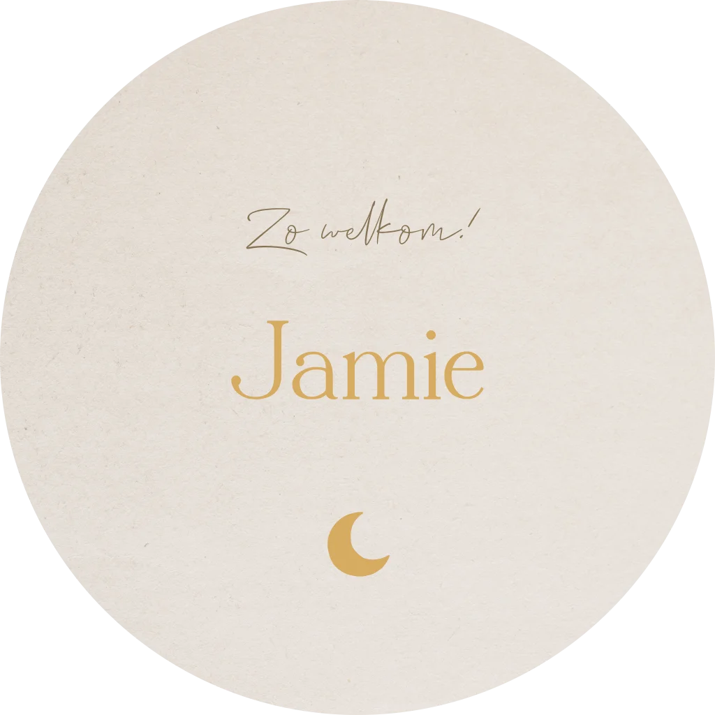 Een stijlvolle ronde raamsticker. De sticker heeft een beige achtergrond met daarop de naam en een maantje. Pas het ontwerp naar wens aan in onze online editor.