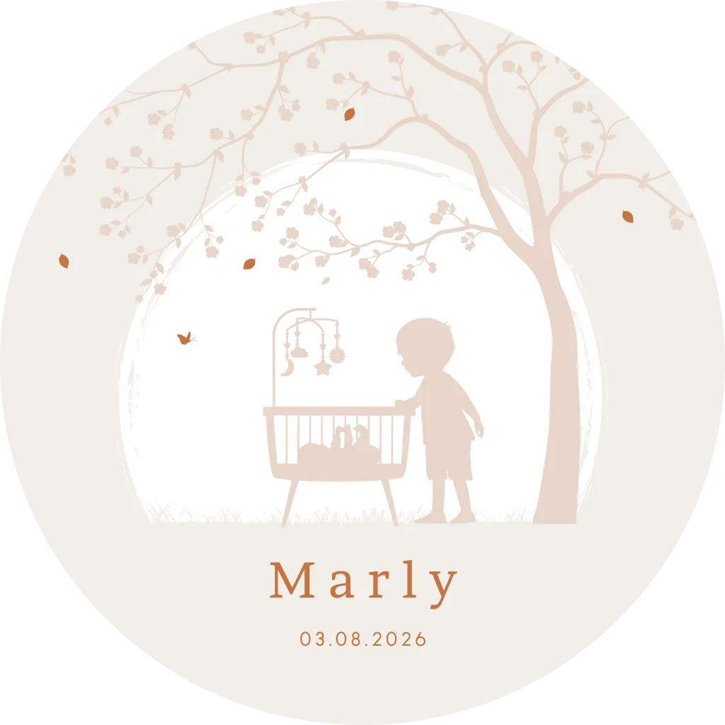Een stijlvolle ronde raamsticker voor jouw kindje. De sticker heeft een beige achtergrond met silhouetjes en een boom. Pas het ontwerp naar wens aan in onze online editor.