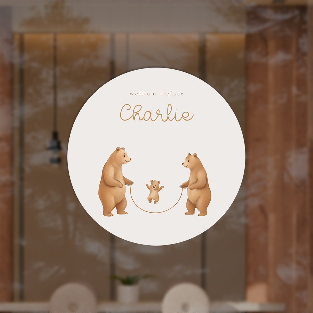 Raamsticker in de stijl van het geboortekaartje: een illustratie van een liefdevol beertjesgezin op een rustige, neutrale achtergrond.