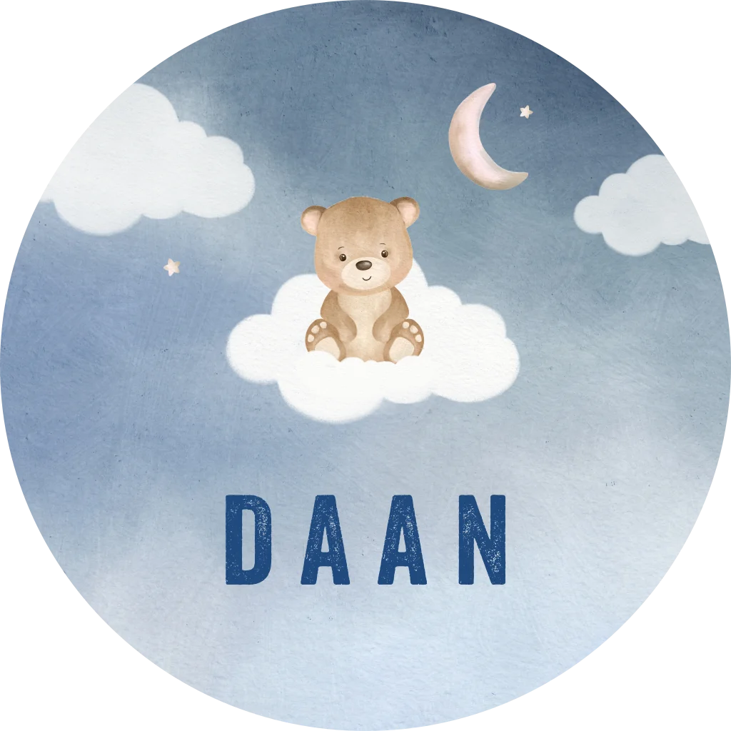 Een ronde raamsticker voor jouw kindje. De sticker heeft een blauwe achtergrond met daarop een beer op een wolkje in de lucht. Pas de raamsticker naar wens aan in onze online editor.