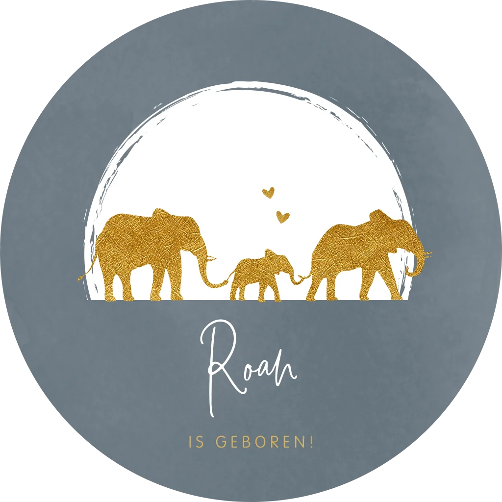 Een stoere raamsticker om de geboorte van jouw kindje aan te kondigen. De ronde sticker heeft een blauw/grijze achtergrond met daarop drie goudlook silhouetjes van olifanten. Pas het ontwerp naar wens aan.