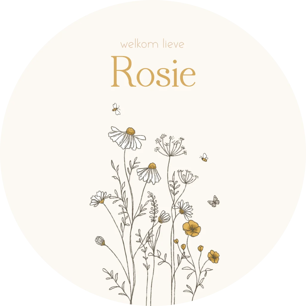 Een vrolijke ronde raamsticker om de geboorte van jouw kindje aan te kondigen. De sticker heeft een gebroken witte achtergrond met lieve bloemen en bijtjes. Maak de raamsticker naar wens op in de online editor.
