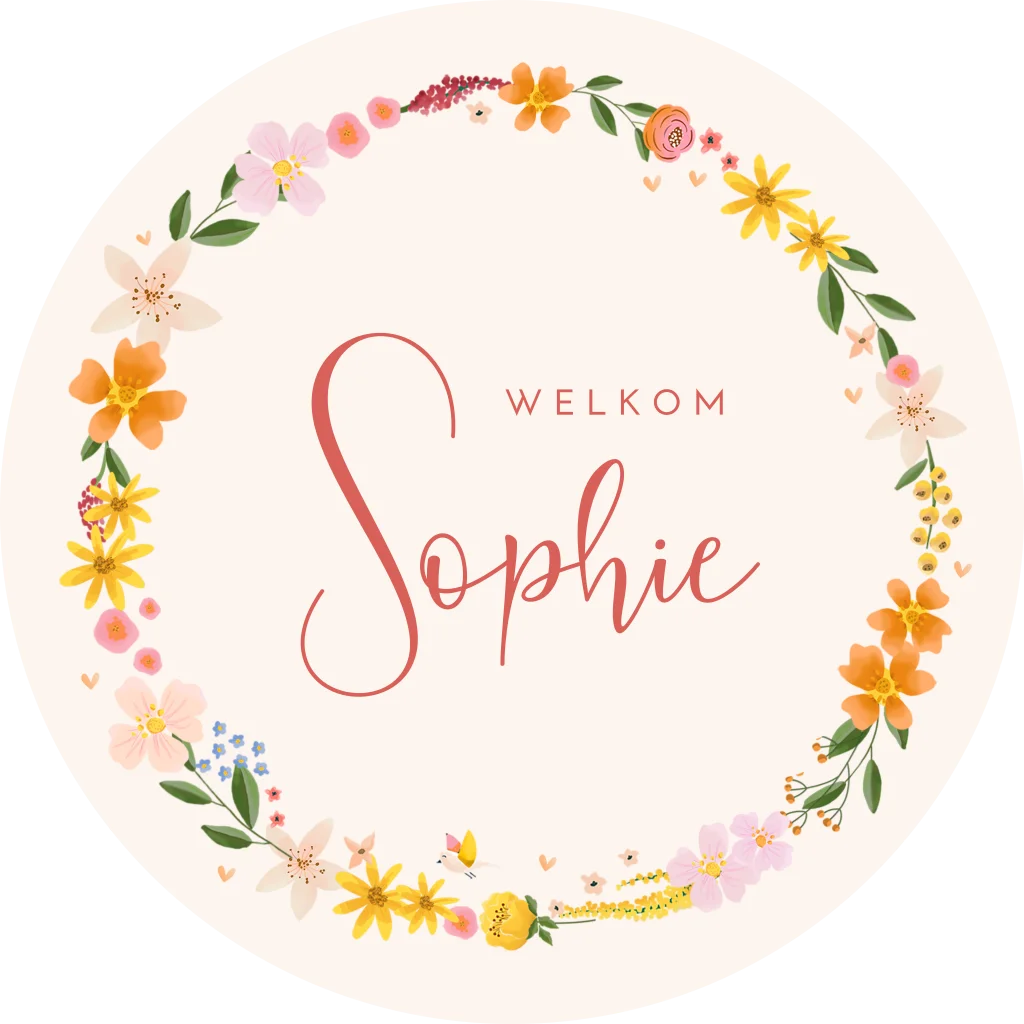Kondig de geboorte van jullie kindje aan met deze ronde raamsticker, met een vrolijke bloemenkrans en pastelkleuren.