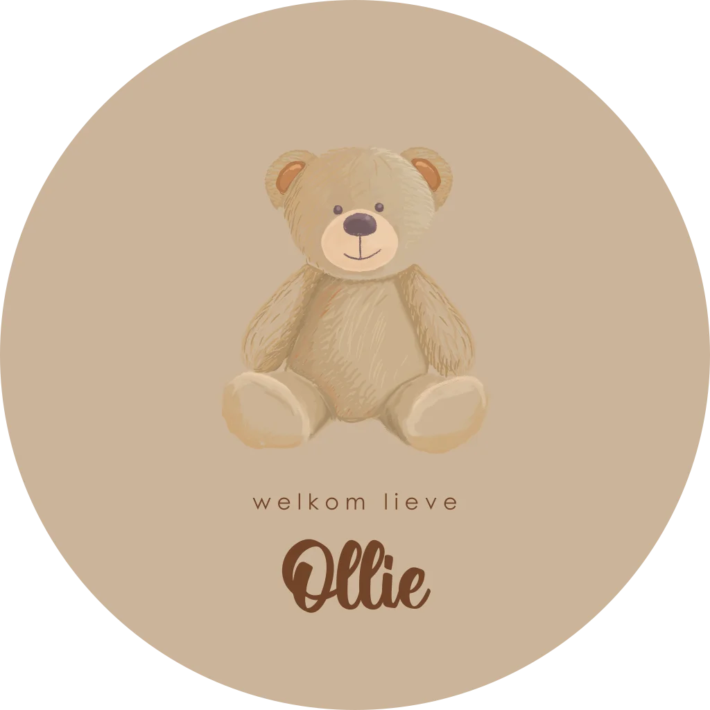 Een lieve ronde raamsticker voor jouw kindje. De sticker heeft een bruine achtergrond met daarop een lief teddybeertje. Pas het ontwerp naar wens aan in onze online editor.