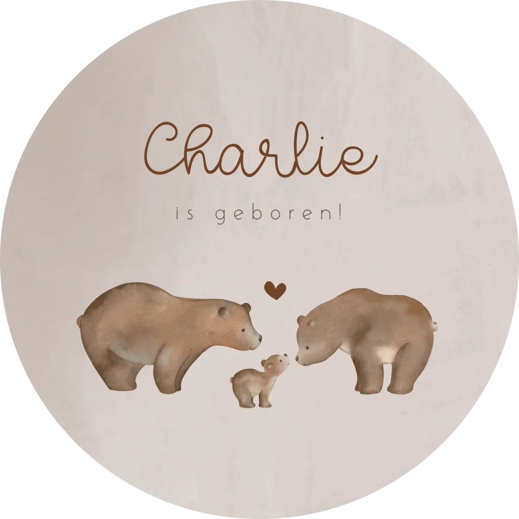 Wat een leuke raamsticker om de geboorte van jouw kindje aan te kondigen. Deze ronde sticker heeft een bruine achtergrond met daarop lieve illustraties van een berenfamilie. Pas de sticker naar wens aan in onze online editor.