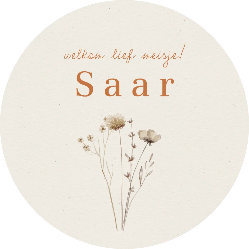 Jullie kleintje is geboren en dat mag de hele buurt weten! Deze raamsticker is rond en heeft een lichte achtergrond. Op de sticker staat de tekst "welkom lief meisje!" met daaronder de naam en een illustratie van droogbloemen. De raamsticker kan helemaal naar wens aangepast worden in onze online editor.