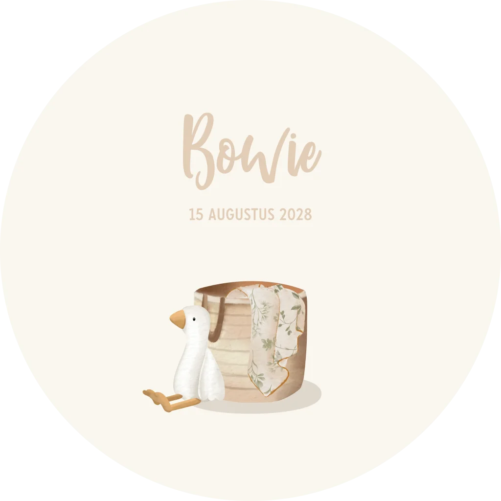 Een stijlvolle ronde raamsticker voor jouw kindje. De sticker heeft een lieve illustratie van een zittend gansje tegen een mandje aan. Daarboven is ruimte voor tekst. Pas het ontwerp naar wens aan in onze online editor.