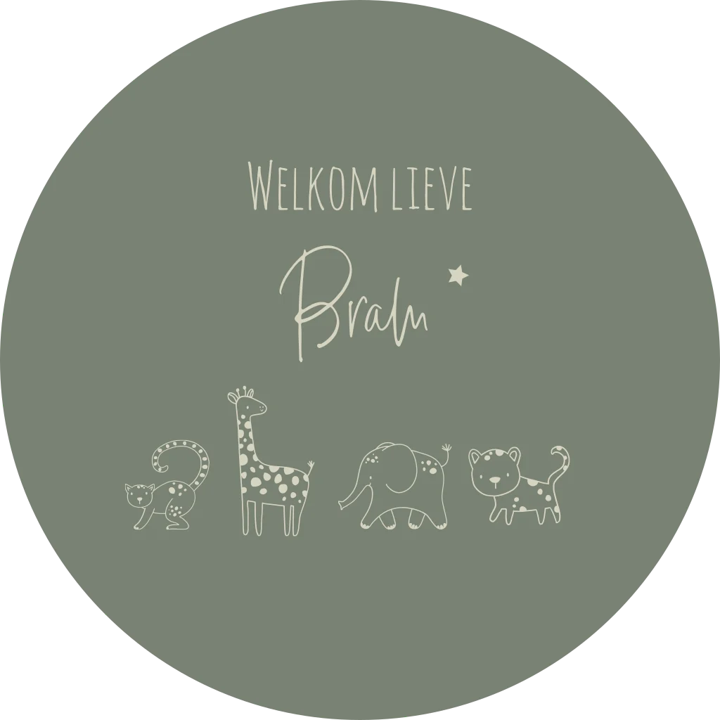 Kondig de geboorte van jullie kindje aan met deze ronde raamsticker, met een stoere groene achtergrond en getekende jungledieren. De sticker is naar wens aan te passen in onze online opmaaktool. Tip: zonder geboortedatum kun je de sticker al voor de geboorte in huis halen!
