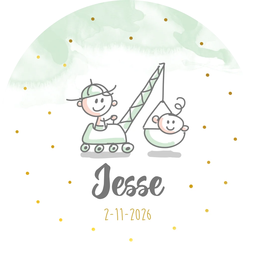 Kondig de geboorte van jullie kindje aan met een eigen ontworpen raamsticker! Deze ronde raamsticker heeft een groene watercolour. Daarop zie je een vrolijke illustratie van een grote broer met zijn kleine broertje in een hijskraan. Laat je creativiteit de vrije loop en kies in onze online editor uit diverse afbeeldingen en achtergronden.