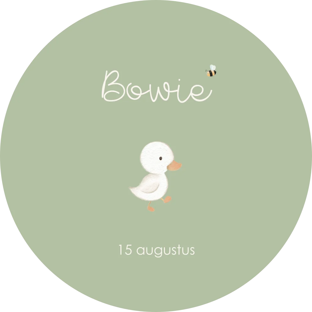 Een vrolijke ronde raamsticker om de geboorte van jouw kindje aan te kondigen. De sticker heeft een groene achtergrond met daarop een vrolijk eendje. Pas de raamsticker naar wens aan in onze editor.