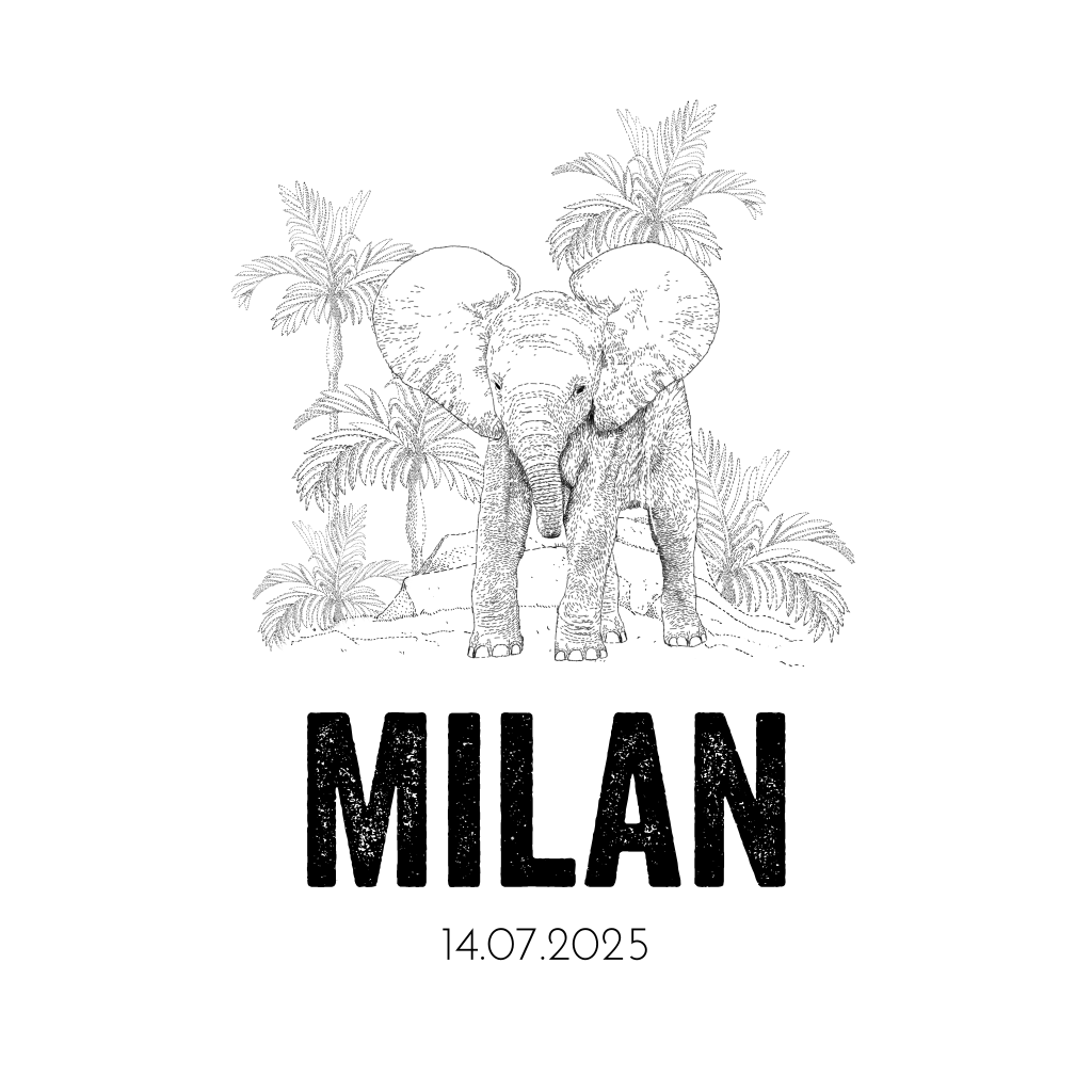 Kondig de geboorte van jullie kindje aan met deze ronde raamsticker, met een stijlvolle zwart wit illustratie van een olifant in de jungle.