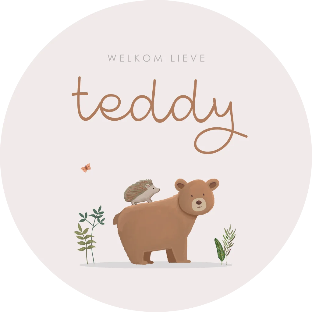 Een vrolijke ronde raamsticker om de geboorte aan te kondigen. De sticker heeft vrolijke illustraties van bosdieren.
