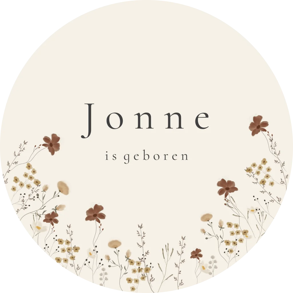 Een stijlvolle ronde raamsticker om de geboorte van jouw kindje aan te kondigen. De sticker heeft prachtige veldbloemen op een lichte achtergrond. Boven de bloemen lees je de naam. Pas de raamsticker naar wens aan in onze editor.
