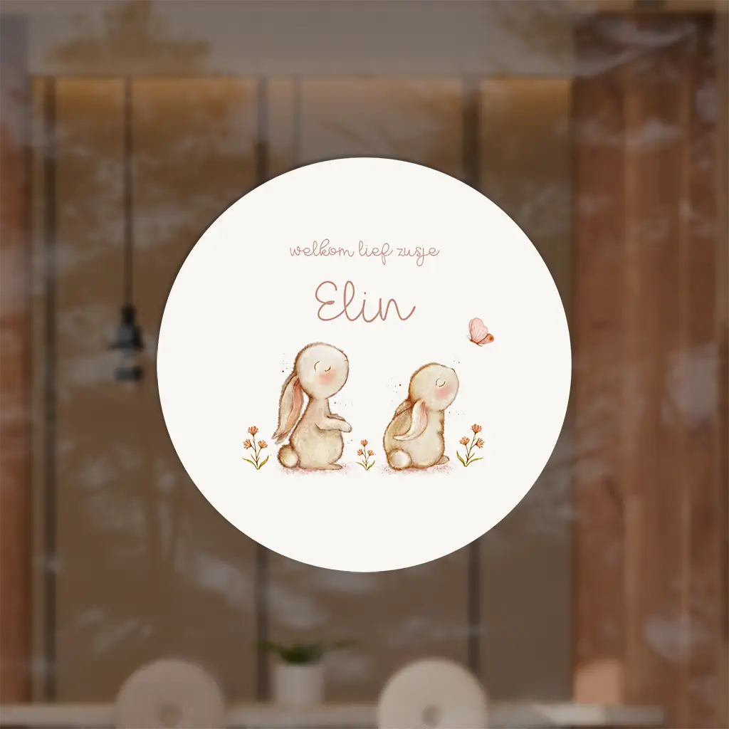 Kondig de geboorte van jullie kindje en zusje aan met deze schattige raamsticker! Deze sticker heeft een lieve illustratie van twee konijntjes met vlinder. Pas de sticker naar wens aan in de online editor.