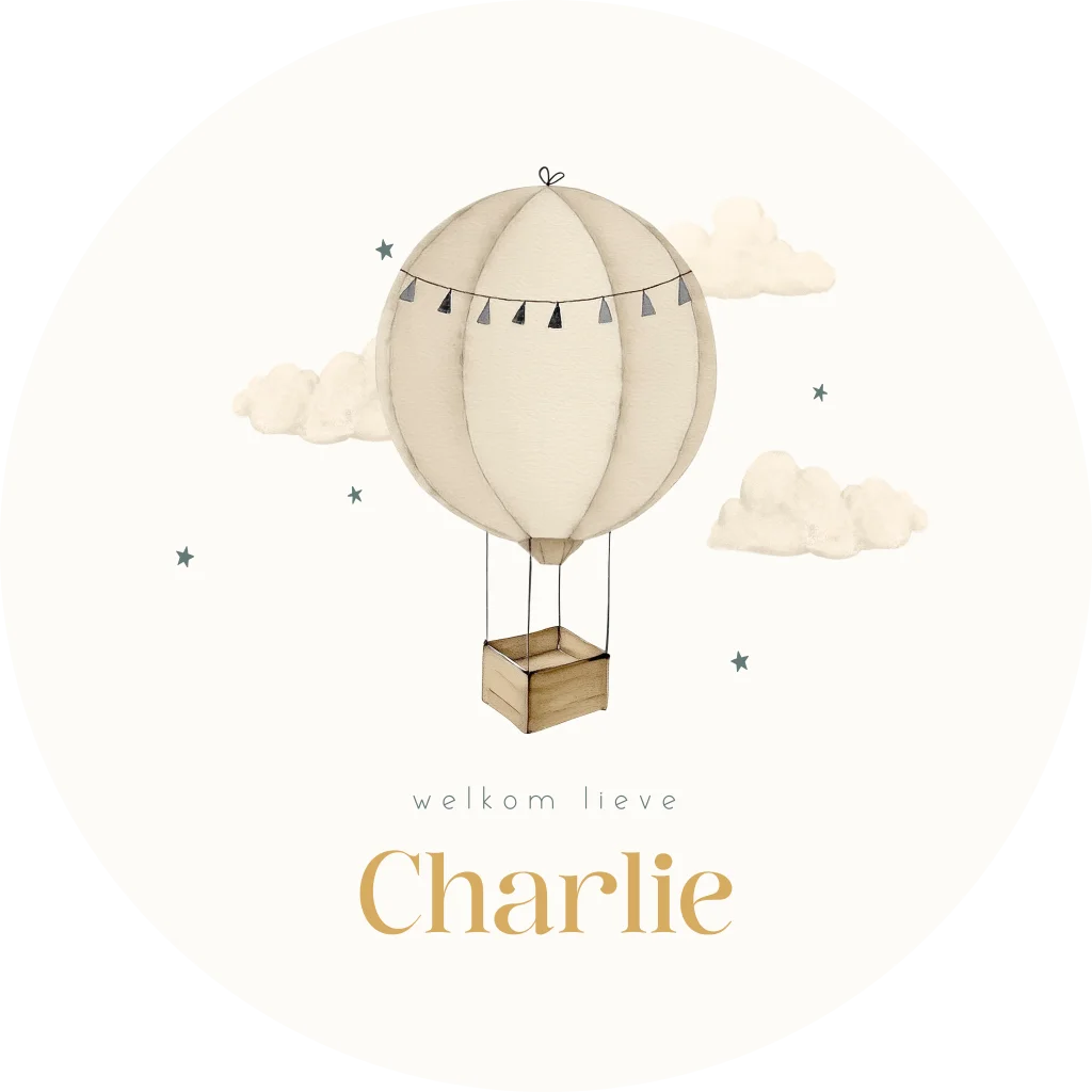 Een stijlvolle ronde raamsticker om de geboorte van jullie kindje aan te kondigen. De sticker heeft een prachtige illustratie van een luchtballon tussen de wolken. Pas de sticker naar wens aan in onze online editor.