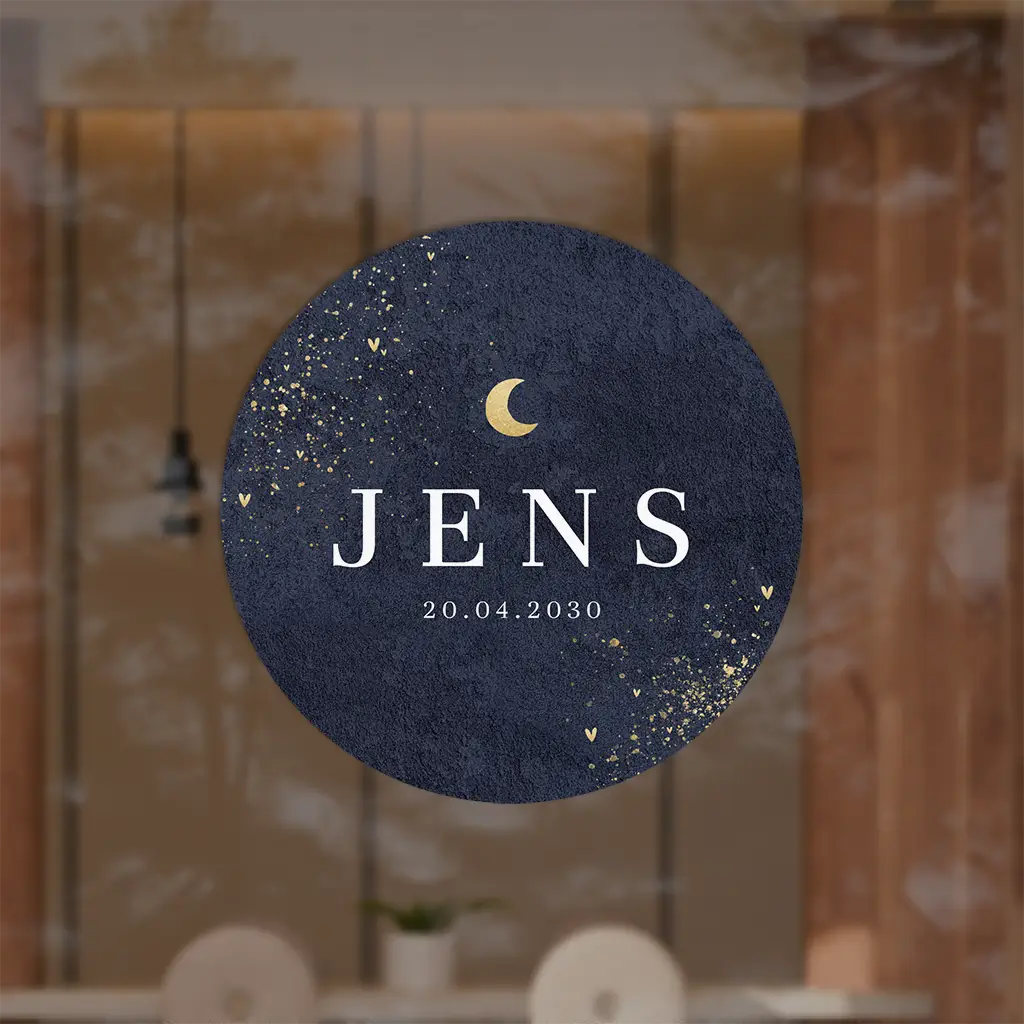 Kondig de geboorte van jullie kindje aan met deze ronde raamsticker, met een stoere structuur achtergrond in het blauw en een lief maantje.