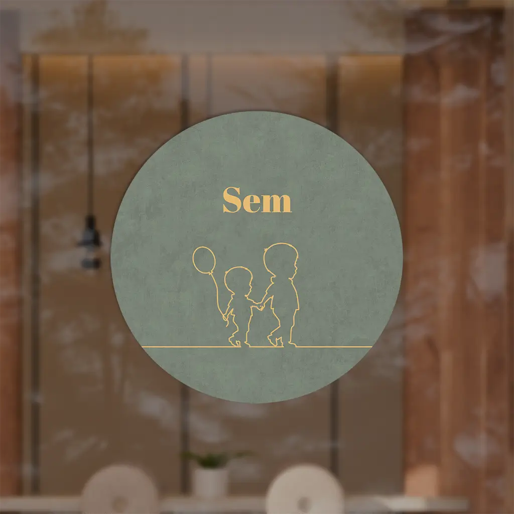 Een ronde stoere raamsticker voor de geboorte van jouw zoontje. De sticker heeft een groen velvet-look achtergrond. Op de voorgrond zie je een lijntekening van twee silhouetjes. Pas de sticker naar wens aan in onze online editor.