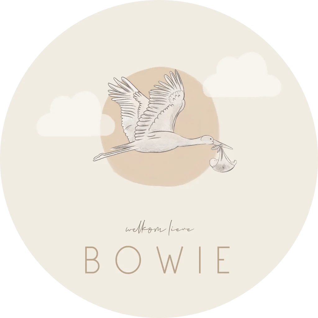 Dit is een lieve raamsticker. De sticker heeft een beige achtergrond met een getekende ooievaar en baby in een knapzak met wolkjes. De raamsticker is naar wens aan te passen in de online editor.