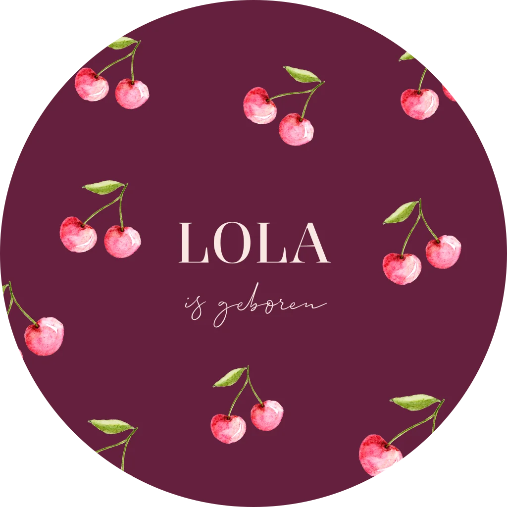 Een vrolijke sluitsticker om de geboorte van jouw kindje aan te kondigen. De achtergrond heeft een paarse kleur. Daarop zie je illustraties van kersen. Pas het ontwerp naar wens aan in onze online editor.