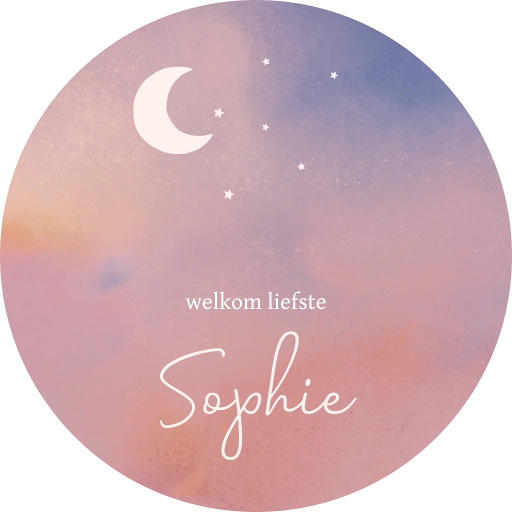 Een stijlvolle ronde raamsticker om de geboorte van jullie kindje aan te kondigen. De sticker heeft een dromerige wolken achtergrond in pastelkleuren. Pas het ontwerp naar wens zelf aan.
