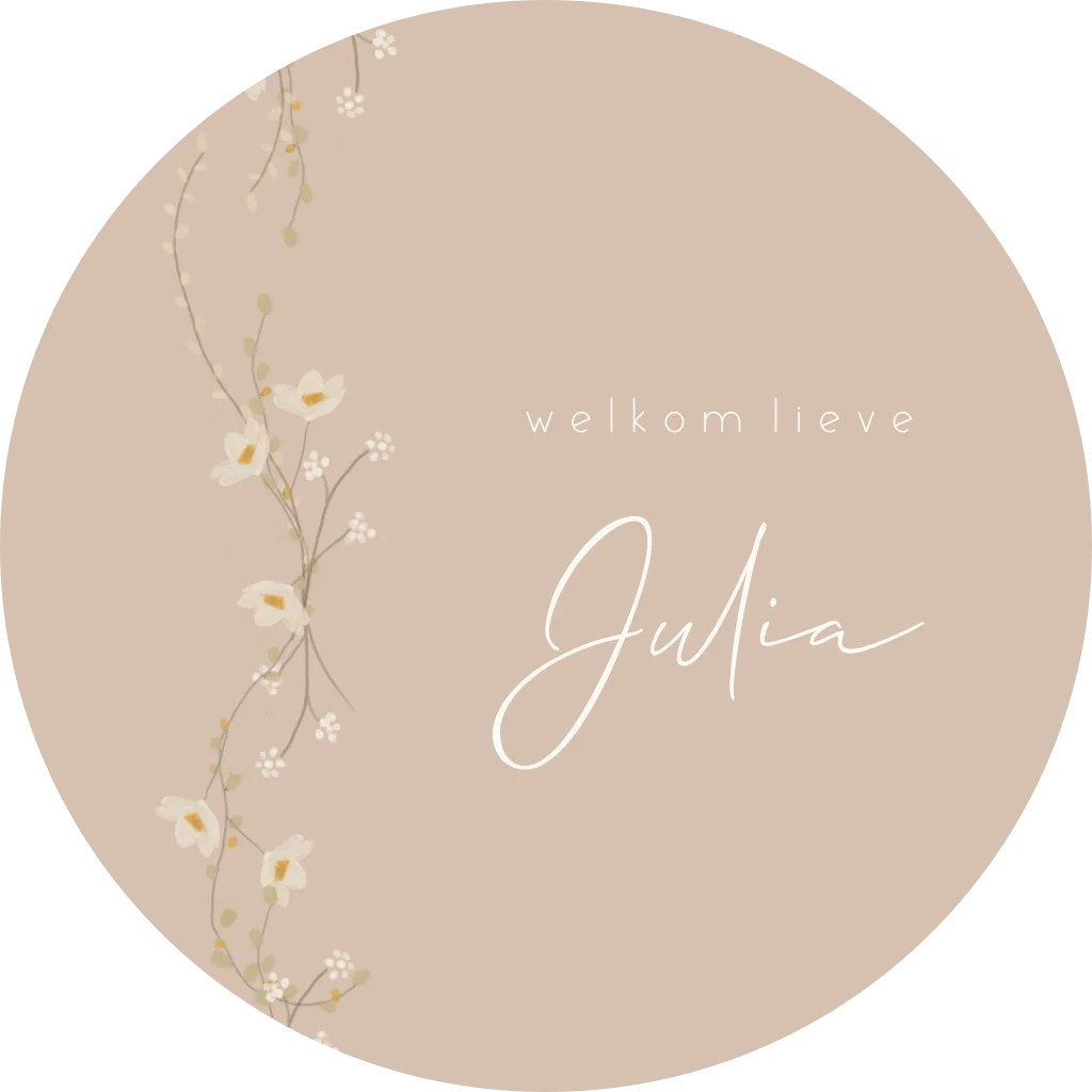 Een stijlvolle en romantische raamsticker om de geboorte aan te kondigen. De sticker heeft een ronde vorm en roze achtergrond. Daarop zie je een bloemenslinger. Pas het ontwerp naar wens aan.