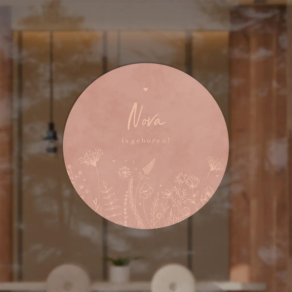 Raamsticker rond roze met lijntekening veldbloemen