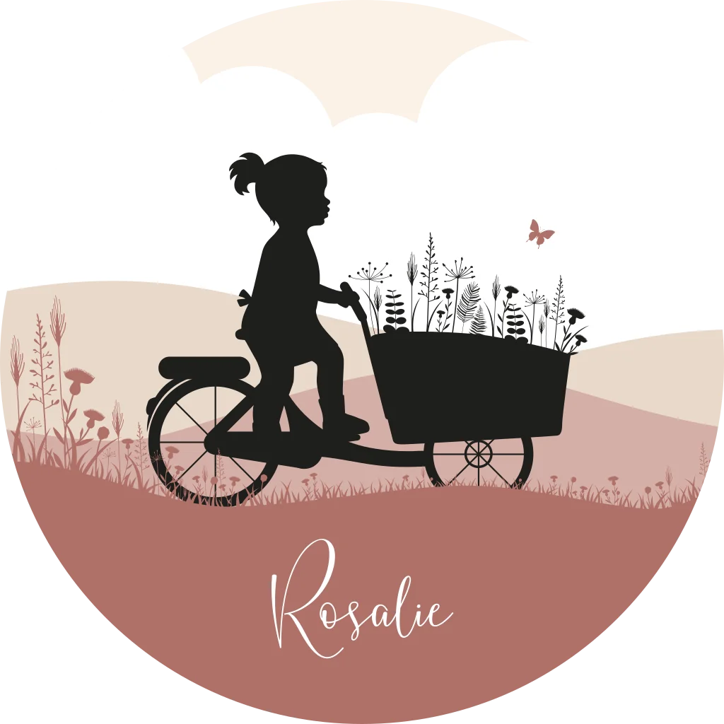 Een vrolijke ronde raamsticker voor jouw meisje. De sticker heeft roze tinten en een lieve illustratie van een meisje op de bakfiets. Pas het ontwerp naar wens aan in onze online editor.