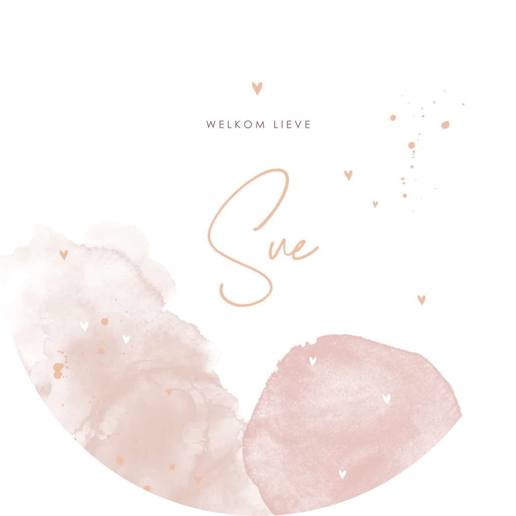 Een romantische ronde raamsticker om de geboorte van jouw meisje aan te kondigen. De sticker heeft een roze watercolour en spetters. Pas het ontwerp naar wens aan in onze online editor.