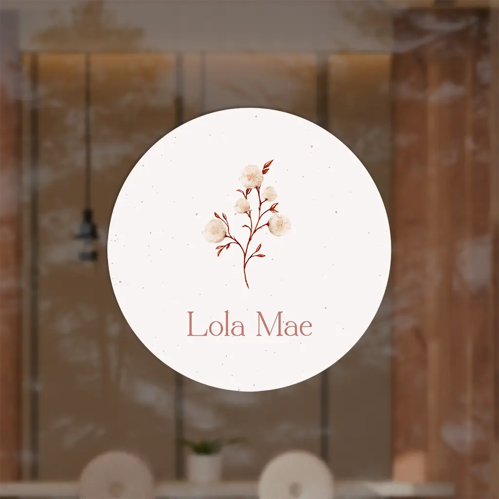 Een lieve ronde raamsticker voor een meisje. De sticker heeft een lichte achtergrond met daarop lieve illustraties van takjes met bloemetjes. Pas het ontwerp naar wens aan in onze online editor.