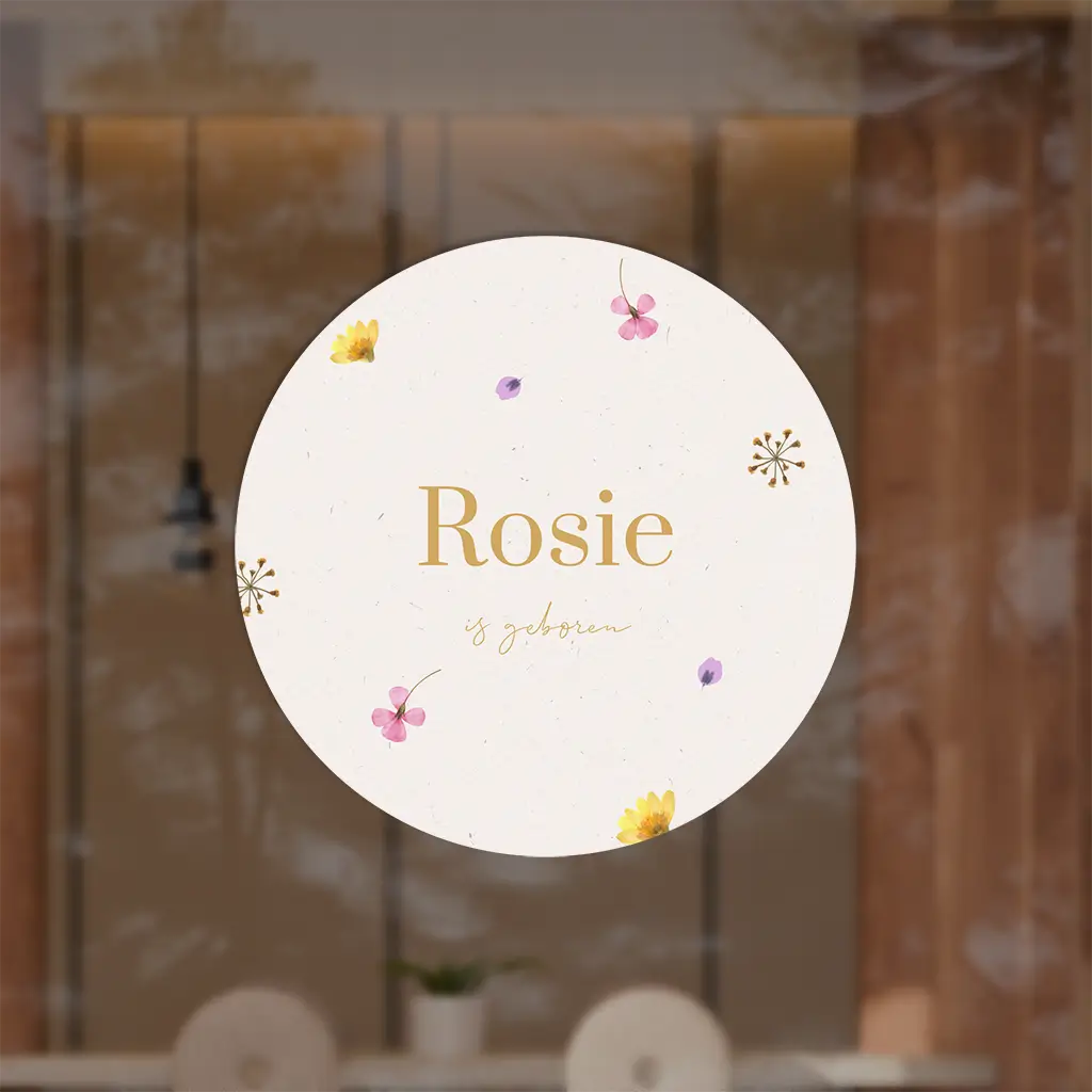 Je kleintje is geboren en dat mag de hele buurt weten! Deze raamsticker heeft gedroogde bloemen in vrolijke kleurtjes, chic! Pas de sticker helemaal naar wens aan in onze online editor.