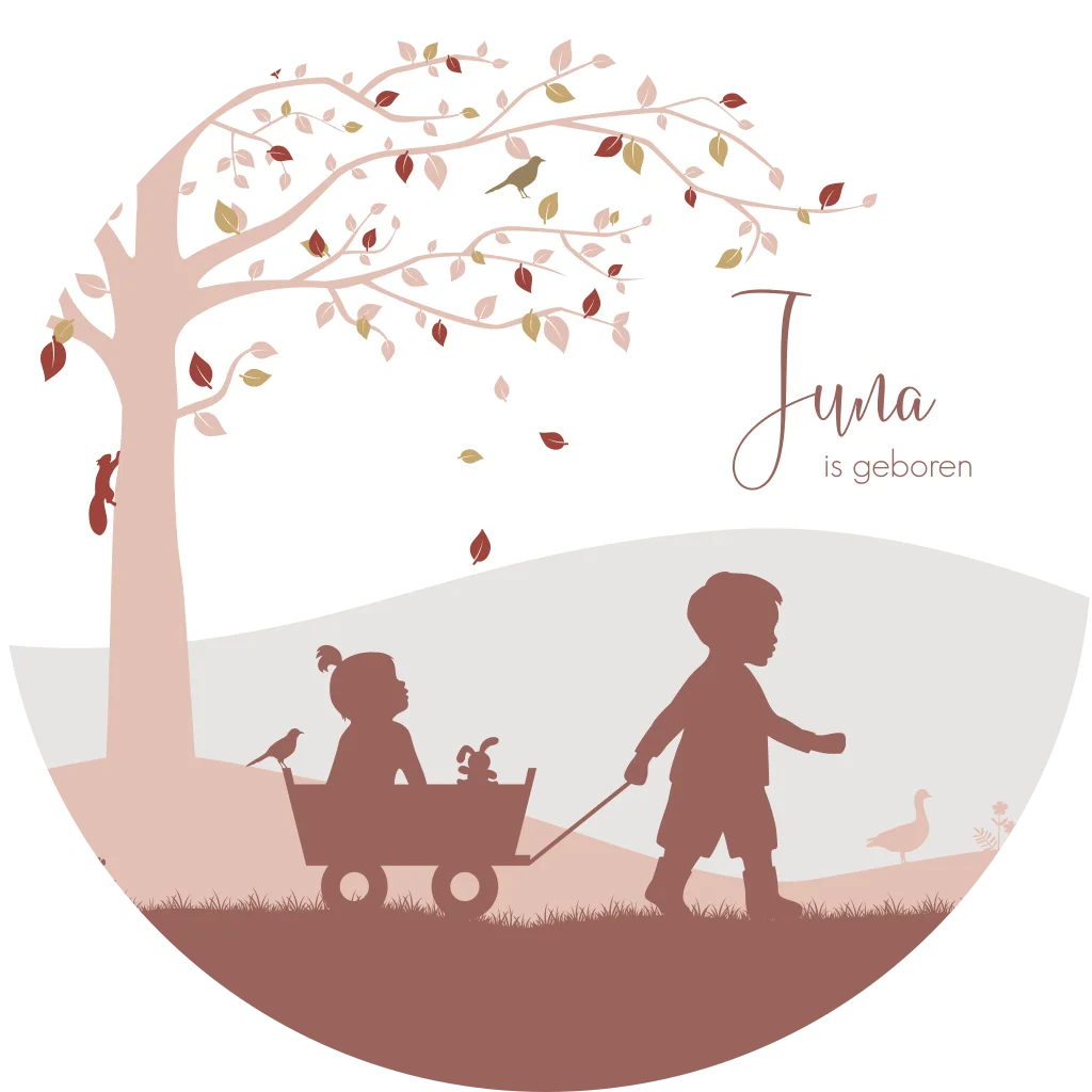 Dit is een originele manier om aan te kondigen dat je kleintje is geboren. Op deze raamsticker zie je de silhouetjes van een broer met zijn zusje in een herfstlandschap. De sticker is naar wens aan te passen in onze online editor.