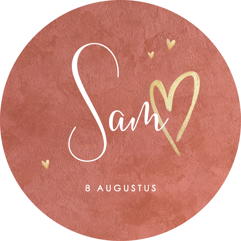 Een stoere raamsticker in steenrode velvetlook om te laten weten dat jullie dochter is geboren. De naam staat centraal in sierlijk wit lettertype, bij de naam staan goudkleurige hartjes, lief!
