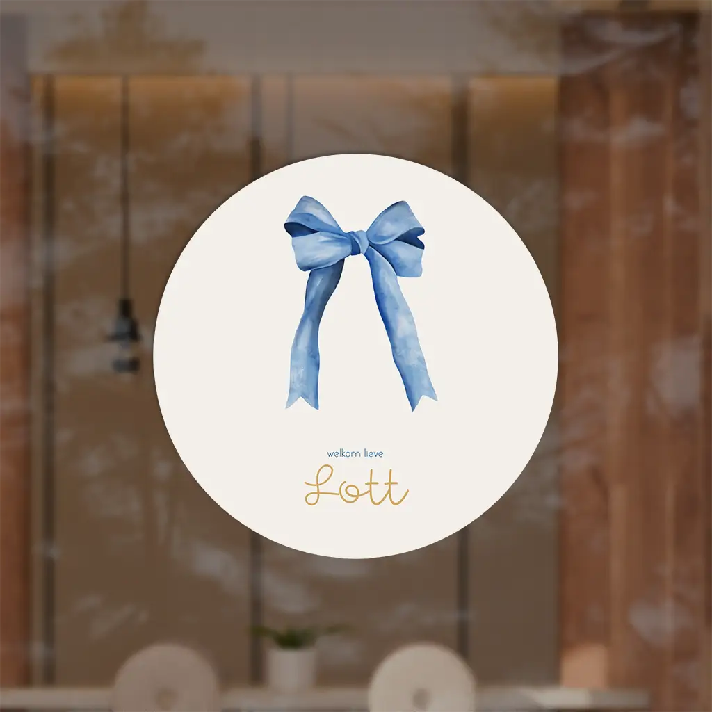 Kondig de geboorte van je kindje op een unieke manier aan met deze raamsticker! De raamsticker heeft een lichte achtergrond met de watercolour illustratie van een strik in het blauw. Pas de sticker helemaal naar wens aan in onze online editor.