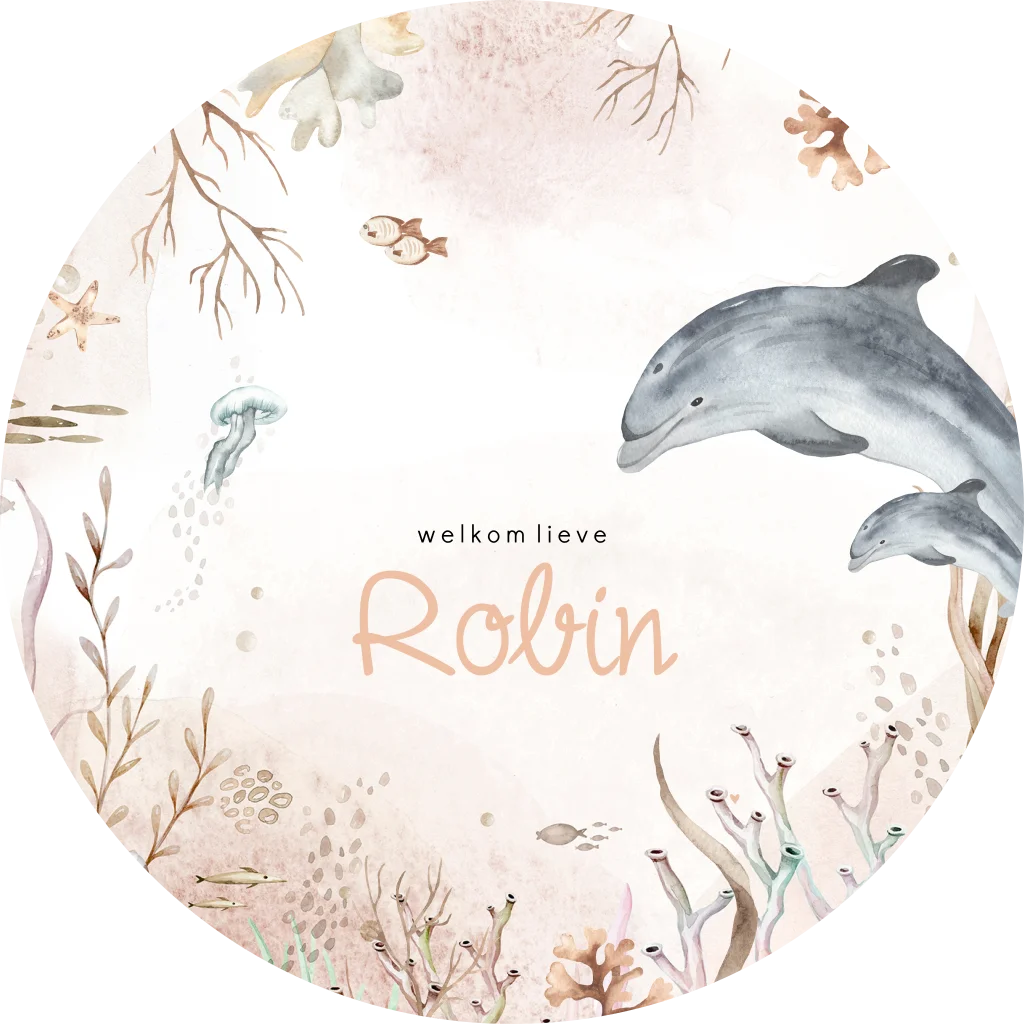 Dit is een originele manier om aan te kondigen dat je kleintje is geboren. Op deze raamsticker zie je een watercolour onderwaterwereld met zwemmende dolfijnen. De sticker is naar wens aan te passen in onze online editor.