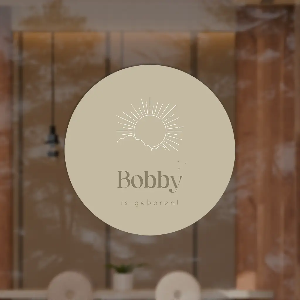 Laat de buurt weten dat je kleintje is geboren met deze raamsticker! Op de sticker zie je de lijntekeningen van een zon en wolkjes. De sticker kan helemaal naar wens aangepast worden in onze online editor.