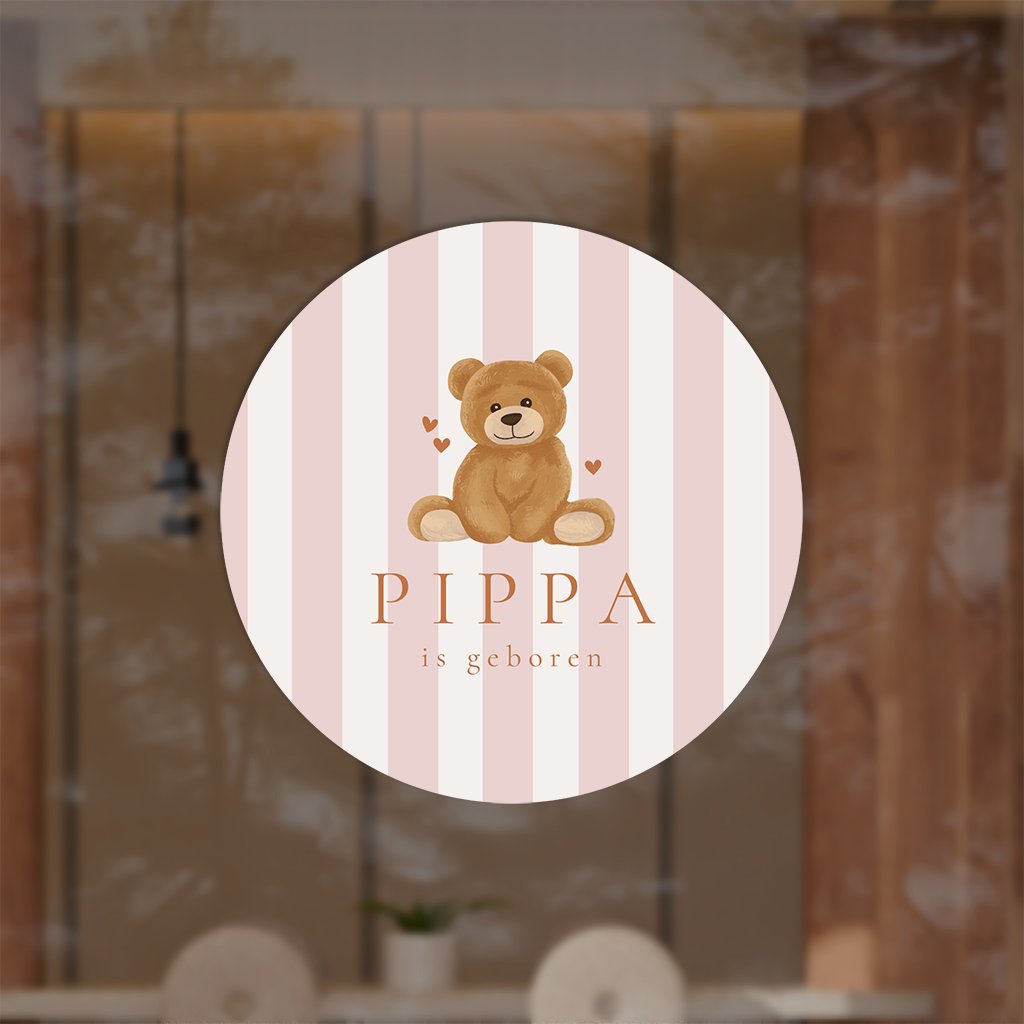 Schattige raamsticker met roze strepen, beertje en hartjes. Leuk om de geboorte van je kind aan te kondigen.