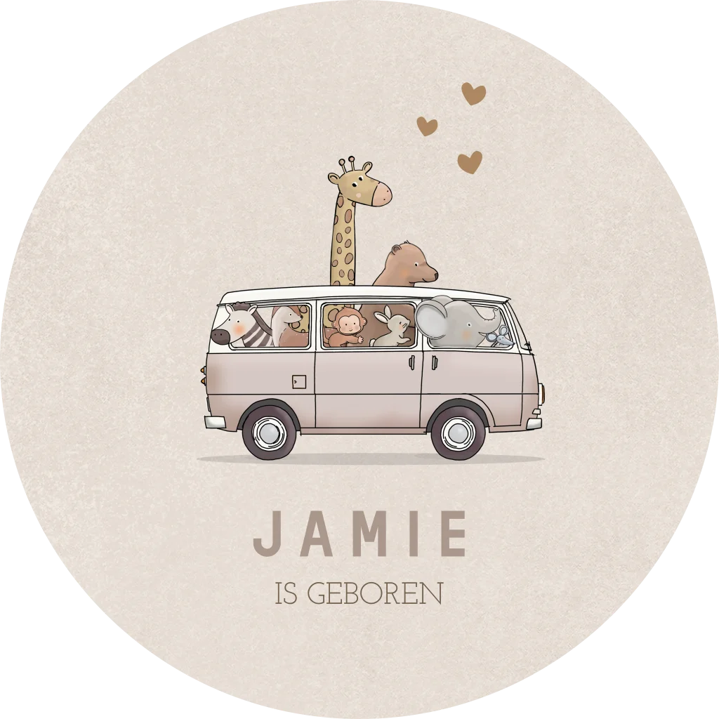 Kondig de geboorte van jullie kindje aan met deze vrolijke ronde raamsticker. Op de raamsticker lees je het adres en zie je een busje met jungledieren zoals een giraf, beer, olifant, zebra, hertje, aap en een muis. De naam van jullie kindje maakt het geheel compleet. De sticker is naar wens aan te passen in onze online opmaaktool. Tip: zonder geboortedatum kun je de sticker al voor de geboorte in huis halen!
