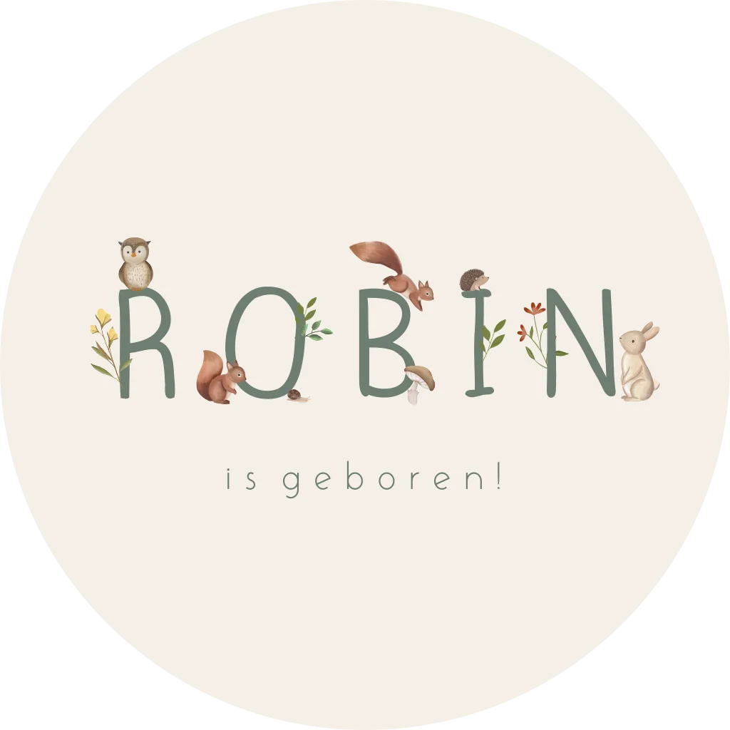 Een lieve ronde raamsticker met beige achtergrond. Je leest de naam van het kindje omringd door verschillende bosdieren. Pas de sticker naar wens aan in onze online editor.